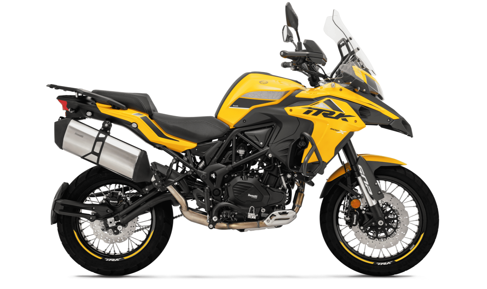 TRK 502 X è la due ruote dal look aggressivo ed accattivante, versione adventure della crossover 500cc della Casa di Pesaro, con ruote a raggi da 19” all'anteriore e 17” al posteriore, realizzata per viaggiare senza confini. TRK 502 X condivide con la versione stradale il motore 2 cilindri in linea, aggiornato secondo la normativa Euro 5, che offre una potenza massima di 47,6 CV (35 kw) a 8500 giri/min e un picco di coppia pari a 46 Nm a 6000 giri. TRK 502 X presenta un setting sospensioni composto da una forcella upside-down con steli da 50 millimetri all’anteriore e al posteriore un forcellone oscillante con mono ammortizzatore centrale regolabile, per assorbire i tratti stradali più sconnessi con la massima facilità. TRK 502 X presenta un terminale di scarico dallo stile ricercato e posizionato in posizione rialzata rispetto alla TRK 502 versione stradale, per affrontare senza problemi anche i fuori strada. Il serbatoio ha una capacità di ben 20 litri. TRK 502 X, aggiornata e rivista nei dettagli, presenta blocchetti comandi al manubrio retroilluminati, specchietti e manopole impreziositi con il logo della moto, così come il paramani, di serie, realizzato in plastica ed alluminio. Manubrio e leva frizione sono regolabili, così da permettere la miglior condizione di guida ad ogni pilota. TRK 502 X presenta inoltre un nuovo portapacchi in lega d'allunimio così come dei pratici nottolini posizionati sotto la sella.